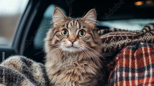 Fluffy cat sitting comfortably in the back of a car packed with blankets and suitcases, ready for a road trip adventure, curious and alert expression