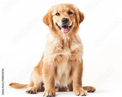 Fluffy golden retriever puppy sitting big brown eyes soft golden fur tongue slightly out adorable pet portrait a white background