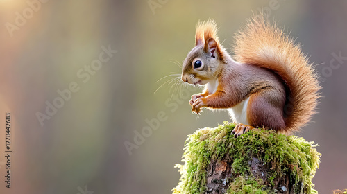 Fluffy red squirrel sitting on a mossy tree stump with a soft, blurred background. Perfect for wildlife photography, autumn themes, or nature-related content. Selective focus