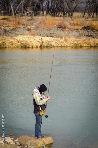 adult, adults only, anticipation, casual clothes, color image, day, dry, fishing, fishing pole, fly fishing, full-length, grass, holding, avocation, lifestyle, land of enchantment, one person, outdoors, people, portrait, river, rock, half face, standing, tree, us, vertical, water, woman