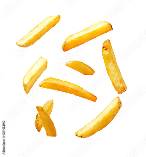 Flying Falling french fries, potato fry isolated on white background [PNG].