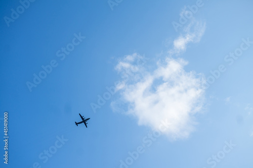 Flying passenger plane on blue sky background