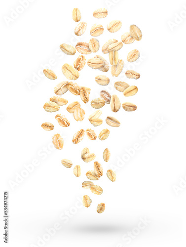 Flying raw oatmeal on white background