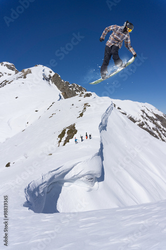Flying snowboarder on mountains. Extreme sport.