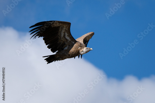 Flying vulture in the sky of the Gorge du Verdon in France. Close up of the big wings and beak