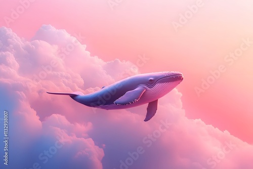Flying whale in pink sunset sky among fluffy clouds. Magical surreal scene with floating marine mammal. Dreamy fantasy artwork for children room decor, book covers and posters