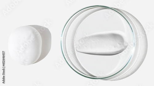 Foam, foam texture. Washing with foam. Foam in a Petri dish on a light background. Dab of cosmetic foam. Lab.