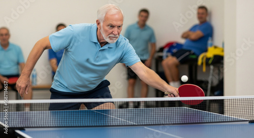 ping pong, recreation, ping pong, athletic, sportsmanship, determination, game, racket, paddle, ball, motion, action, concentration, hobby, leisure, male, man, senior citizen, pensioner, sport, exercise, physical activity, agility, competition, fun, healthy lifestyle, fitness, retirement, engagement, short, sneaker, player, opponent, net, playing