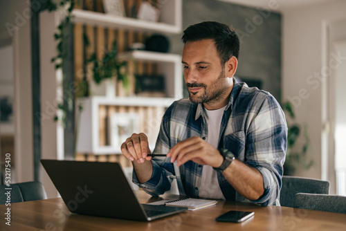 Focused adult man having a business meeting, using a laptop, at