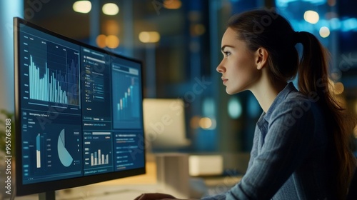 datum, technology, female, business, chart, night time, computer-screen, analysis, professional