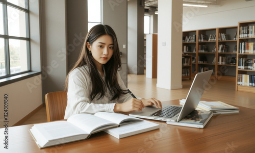 focused Asian university student studies in modern library, surrounded by books and laptop. serene environment enhances her concentration and learning experience