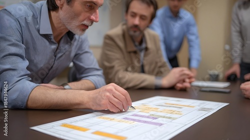 Focused business professionals discussing a detailed color coded project plan during a meeting