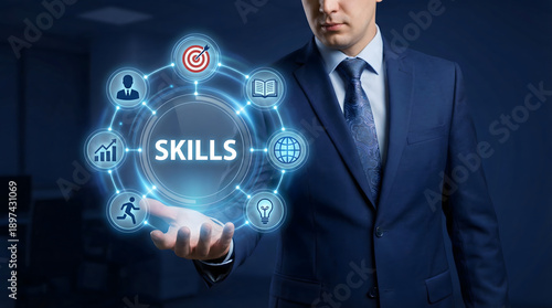 Focused businessman presents glowing digital SKILLS interface with icons for career development growth and learning in a professional blue setting