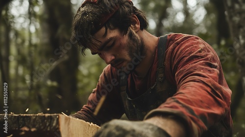 man, wood, forest, working, cutting, lumberjack, craftsman, focused, red, shirt, overall, sawdust, nature, outdoors, construction, industry, hard, labor, work, skill, manual, labourer, carpenter, bearded, young, male, concentrated, serious, determination, rustic, green, tree, leaf, sunlight, shadow, grit, dirt, carpenter's shop