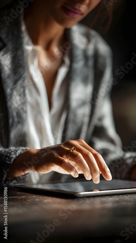 entrepreneur, investment, portfolio, tablet, screen, business, finance, technology, success, woman, hand, digital, datum, analysis, research, sharpened, monochrome, dark, lighting, texture, detail, modern, professional, corporate, industry, career, achievement, strategy, planning, progress, wealth, income, growth, development, empowerment, leadership, entrepreneurship, innovation, future, productivity, efficiency, management, profit