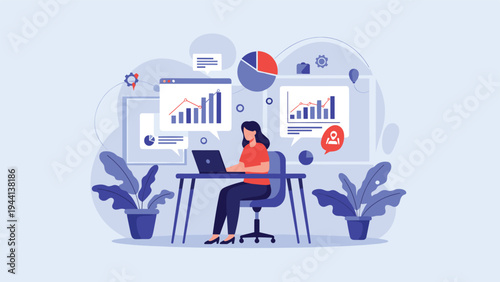 woman, laptop, technology, professional, workspace, coding, dashboard, research, statistic, growth, chart, graph, digital, information, business, men at work, online, concentration, desk, plant, office, productivity, marketing, strategy, management, communication, software, computer, cyberspace, visualisation, vector, illustration, modern, job, career, expert