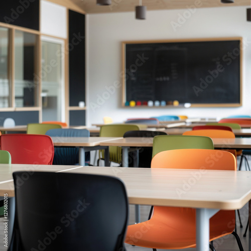 Focused macro shot of an empty classroom, featuring a modern blackboard and stylish furniture, brightly lit.