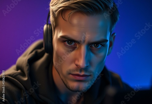 concentration, intense, body, gamer, upper, professional, room, portrait, human, sharpened, even, purple, dimly, background, lighting, lit, look, people, hue, focused, clean, soft, aesthetic, copy, male, blue, mood, space