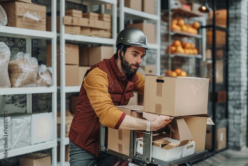 Focused male worker in safety helmet arranging cardboard boxes on a cargo scooter in a modern warehouse