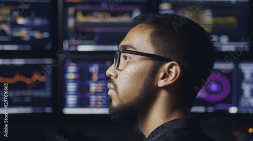 man, person, male, adult, professional, businessman, office, workplace, technology, screen, monitor, datum, chart, graph, digital, computer, innovation, future, futuristic, modern, network, cyberspace, information, analysis, business, career, job, work, employee, focused, concentration, serious