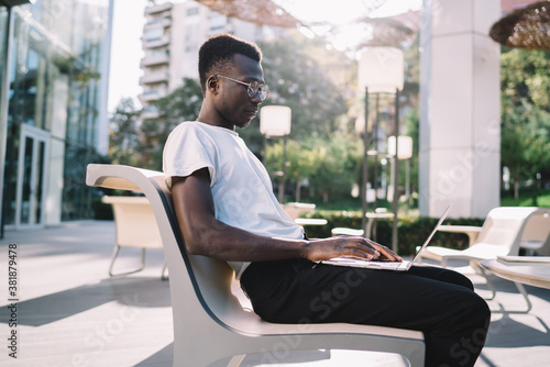 man, laptop, project, business, browsing, eyeglass, casual attire, outfit, male, using, contraption, freelance, work, african american, black, device, cyberspace, online, surfing, job, entrepreneur, tied-up, modern, remote, professional, guy, condensed, computer, contemporary, career, occupation, distance, digital, network, information, research, smart, manager, serious, intellect, intelligent, analysis, datum, canvasses, outside, lifestyle, half face, from below, backlit, blurred background