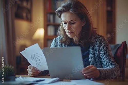 Focused Middle Aged Woman Reviewing Retirement Finances on Laptop at Home Office