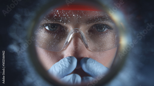 Focused researcher wearing protective eyewear and gloves, examining through circular lens. image conveys sense of concentration and scientific inquiry in laboratory setting