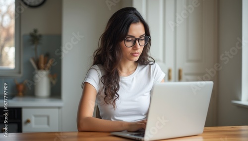 woman, laptop, home, work, focused, goggles, young, casual attire, technology, concentration, cosy, interior, productivity, modern, lifestyle, engagement, workspace, creativity, light, serene, atmosphere, home office, casual clothes, digital, connection, professional, thoughtful, elegant, calm, stylish, dedication, warmth, inspiration, contemporary, sharpened, task, working woman, relaxed, ambience