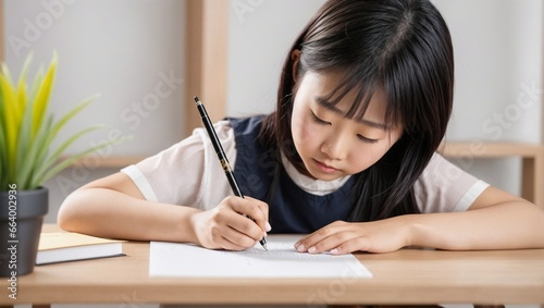 Focused young asian schoolgirl writing for academic exam study