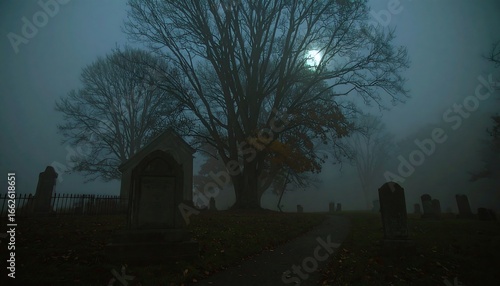 fog, cemetery, night, tree, moon, skittish, dark, misty, grave, path, autumn, leaf, church, old, stone, gravestone, silence, death, gloom, mystery, haunted, eerie, still, cold, silhouette, landscape, nature, creepy, atmosphere, calm