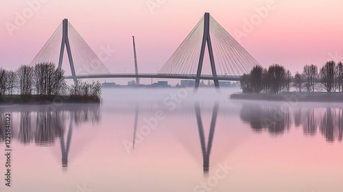 bridge, water, fog, sunrise, pink, sky, morning, landscape, travel, architecture, cable, river, calm, peaceful, tranquil, mist, nature, outdoors, dawn, structure, construction, silhouette, scenic, light, haze, transportation, urban, city, industrial, metallic, environment, engineering, modern, connection, symmetric, design, geometry, perspective, concrete
