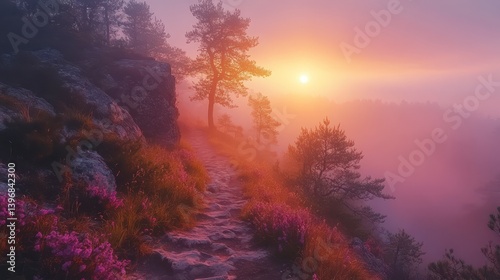 sunrise, fog, mountain, path, landscape, nature, scenery, pink, orange, sky, tree, flower, rock, trail, misty, morning, dawn, peaceful, serene, tranquil, scenic, view, climb, summit, heather, beauty, outdoors, wanderlust, adventure, explore, journey, destination, vacation, travel, tour tourism, relaxation, holiday, aethereal, dreamy, mystical, inspiration, sunlight, glow, radiant, horizon, distance, wilderness, countryside, elevation