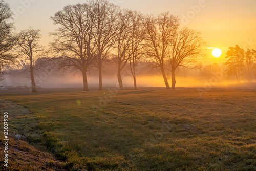foggy winter autumn morning in the countryside far from the city. low fog hanging over the fields next to the forest. small flowing river. idyllic landscape. spectacular colorful sunrise.