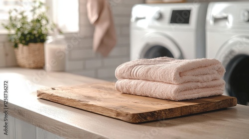 Folded soft pink towels sit on a wooden board, embodying cleanliness and home care. Ideal for promoting laundry products, spa services, or home organization solutions.