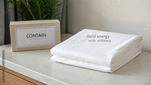 Folded White Linen on Sleek Surface with Inspirational Text and Decorative Box for Home Decor and Minimalist Styling