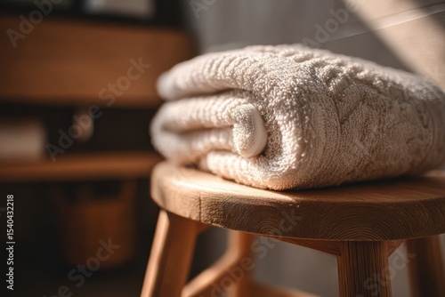 Folded white towel resting on a wooden stool captures the warm ambiance of a tranquil bathroom retreat
