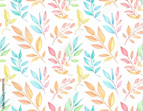 Foliage seamless pattern of colorful branches with leaves, watercolor floral illustration on white background.