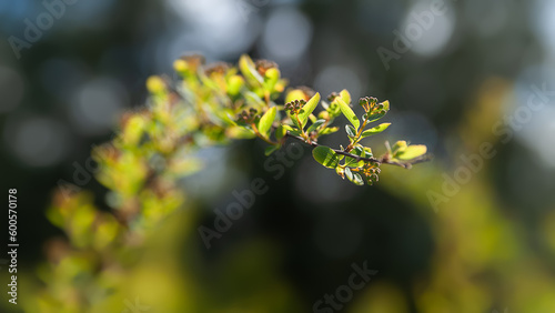 Foliage to light. Glow of young green foliage of a bush in a sunbeam. Shallow depth of field. Selective focus