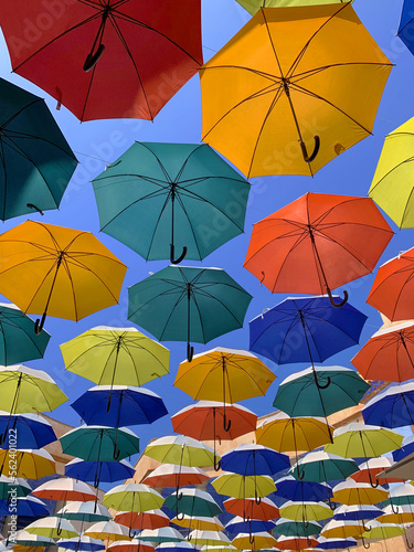umbrella, parasol, colourful, colours, background, coloration, heaven, street, sun, vivid, heat, security, many-coloured, flashy, shadow, lovely, happy, decorative, yellow, green, red, blue