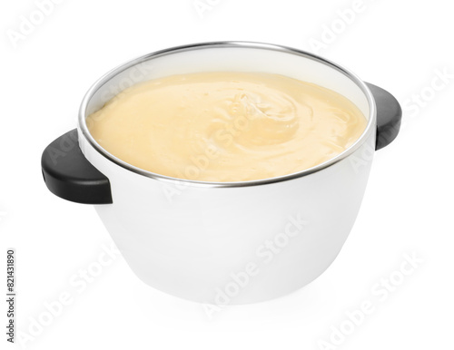 Fondue pot with tasty melted cheese isolated on white