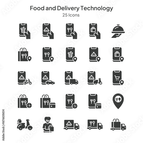 icon, icon, collection, set, vector, illustration, pictogram, design, element, symbol, logistic, eatery, e-business, food, digital, tech, shopping, grocery, take-away, take-out, courier, tracking, location, transportation, drone, scooter, car, truck, automation, online shopping, marketplace, app, mobile, smartphone, order, client, cafes, menu, reservation, kitchen, online