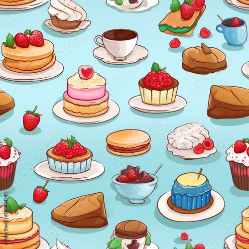 food, dessert, confectionery, seamless, pattern, cake, cupcake, vector, dessert, sweet, chocolate, birthday, bakery, cream, muffin, illustration, set, cherry, candy, cartoon, strawberry, cup, icon, cute, decoration, party, delicious