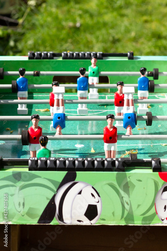 blue, baby foot, football, game, goalie, goalkeeper, goal, grass, kicker, number, outdoors, outside, playtime, real, red, shirt, soccer, table, used