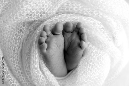 Foot of a newborn. Close up feet, toes, heels, feet of a newborn baby. Studio monochrome, vintage style, black and white macro photography.
