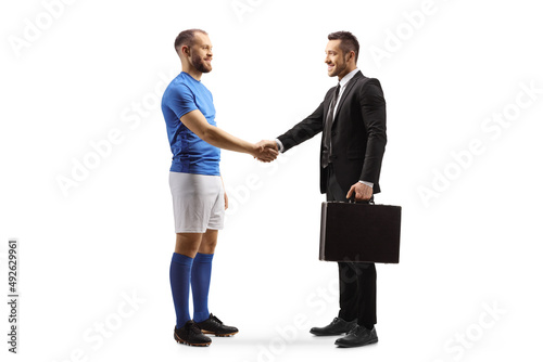 Football player and a businessman shaking hands