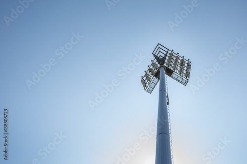 background, blue, bright, electric, electricity, energy, equipment, football, halogen, illuminated, illumination, lamp, light, light, metal, pole, power, sky, soccer, sport, spotlight, stadium, tower, white