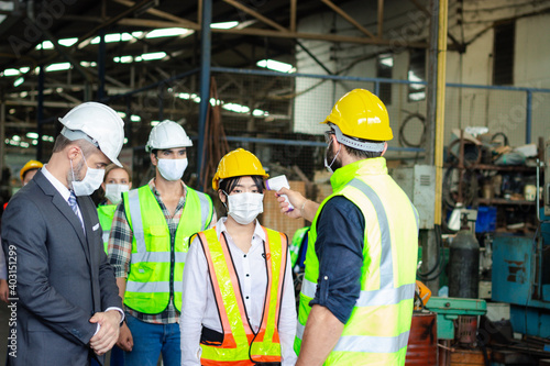 Foreman hold digital thermometer, measure temperature for screen workers with face mask, prevent against infection of Covid-19 outbreak, industrial engineers in line at manufacturing industry factory