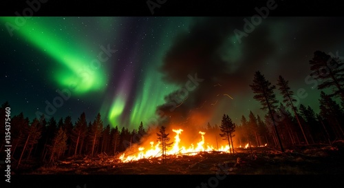 forest, fire, burning, aurora, borealis, night, landscape, tree, standing, dark, dramatic, nature, pine, flames, glowing, sky, star, green, purple, silhouette, environmental, damage, disaster, wildfire, climate, change, destruction, night time, danger, emergency, light, illuminated, scenic, north, smoke, abstract, twilight, season, travel, awareness