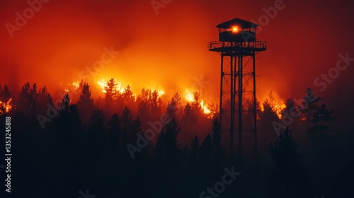 fire, forest, wildfire, flames, night, tower, smoke, danger, emergency, disaster, heat, hot, red, orange, dark, silhouette, tree, wood, nature, landscape, burning, destruction, blaze, inferno, glow, light, bright, intense, ominous, scarey, alarm, warning, crisis, impact, environment, global, warming, climate, change, problem, serious, threat, rescue, safety, control, prevention, investigation, research