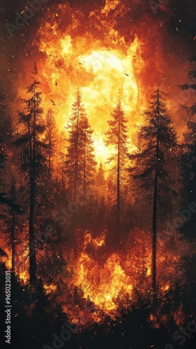 Forest fire rendered in abstract expressionism style, utilizing bold brushstrokes and vivid colors to convey the emotional and chaotic nature of the blaze.
